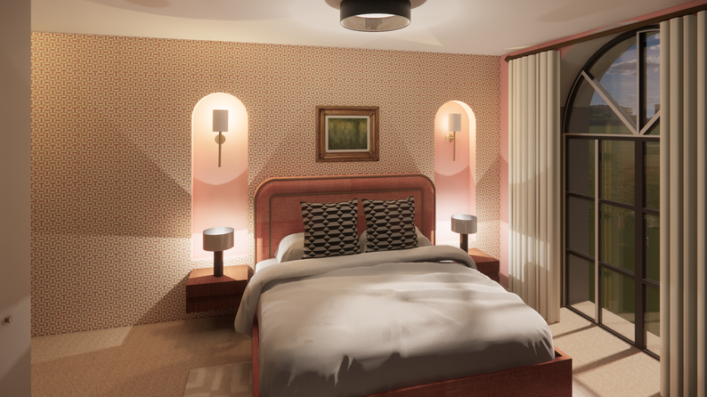 The aim for my redesign was to create a mature yet playful hotel atmosphere for young professionals to enjoy from all around the world. By doing this I implemented bright colors such as reds, pinks, and oranges in order for guests to be energized and used a mix of eclectic materials and furniture to keep the spaces timeless and lively. For this project I worked in Sketchup and Enscape.
